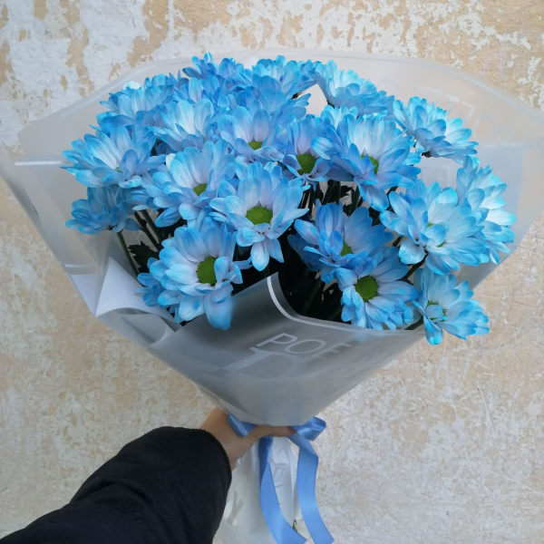 Букет из 5 веток синих или голубых хризантем в упаковке.