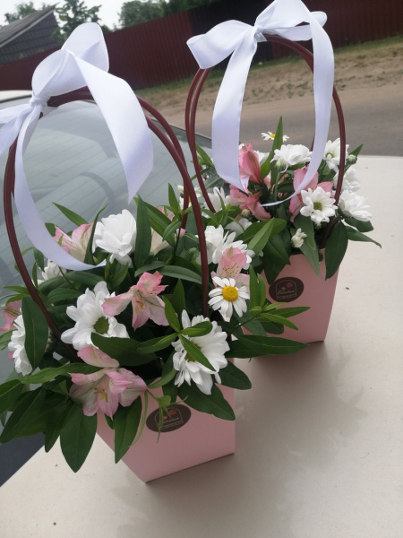 Сумочка, наполненная альстромериями, зеленью и хризантемой.