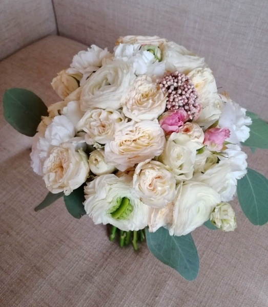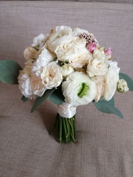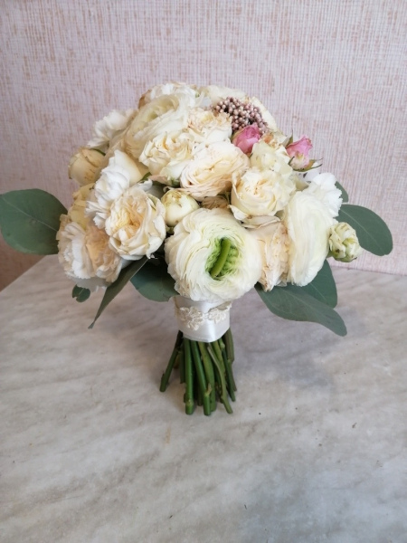 Букет невесты из шикарных белых ранункулюсов, пионовидной кустовой розы оттенка айвори, кустовой розы мадам бомбастик, белой розы сорта альба, озотамнуса, хлопка и белой гвоздики шабо, по краям букет обрамлен эвкалиптом популус.