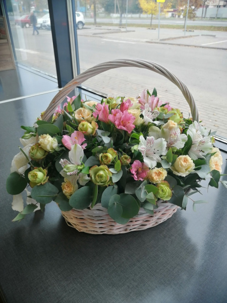 Корзина, наполненная альстромериями, кустовыми розами и зеленью.