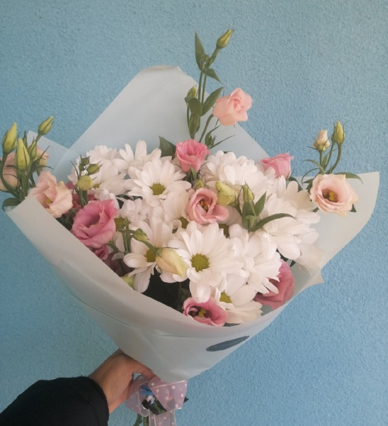 Букет из хризантем (3) и эустом (2) в нежной упаковке. Оттенок цветов и упаковки может быть иным, в зависимости от наличия на складе.