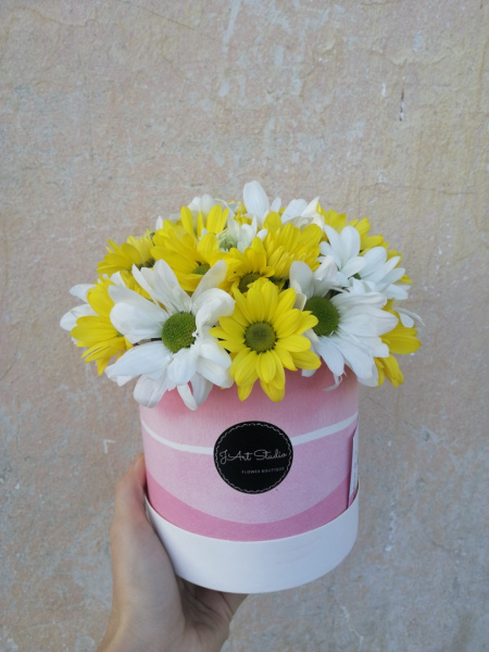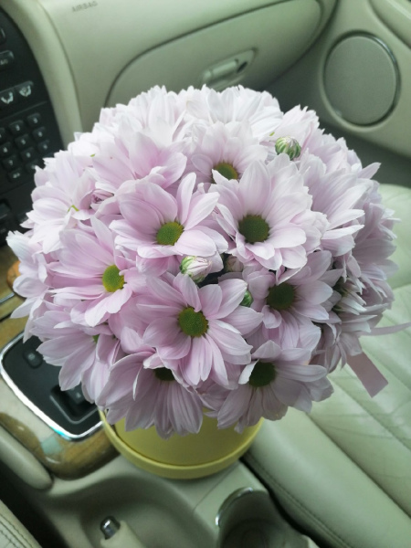 Шляпная коробка, наполненная хризантемами - отличный подарок практически по любому поводу.