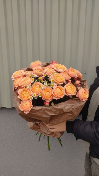 Букет из 9 веток пионовидной кустовой розы Джульетта и 2 веток танацетума в стильной упаковке