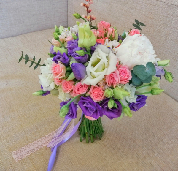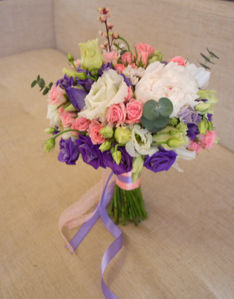 В составе букета нежная эустома двух сортов, пионы, кустовая голландская роза, эвкалипт гунни, аллиум, гейхера.