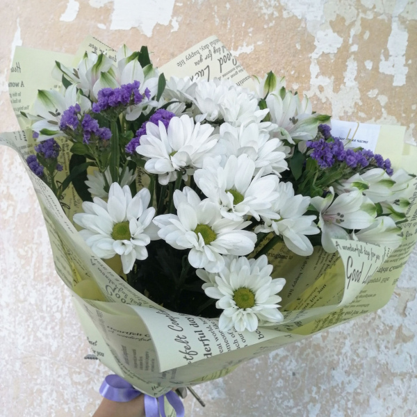 Букет из альстромерий (3), хризантем(2) и статицы(2) в упаковке.