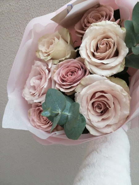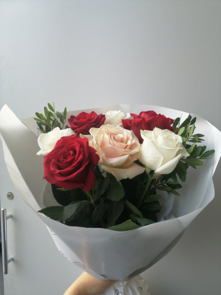 Букет из 7 роз любого оттенка, в зависимости от наличия на складе и пожеланий Заказчика с зеленью (2) в двухслойной упаковке.