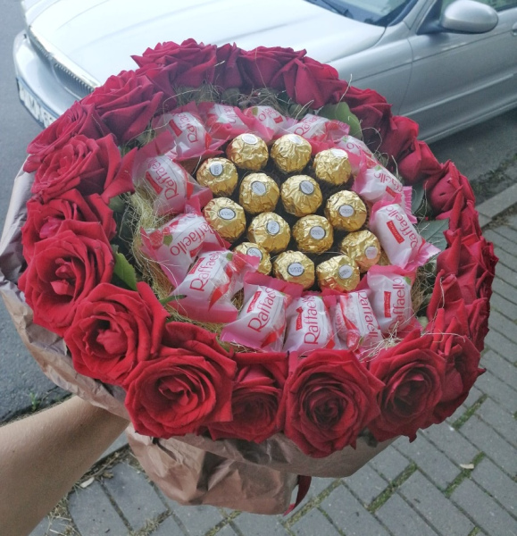 Букет из 25 роз любого оттенка, в зависимости от наличия на складе и пожеланий Заказчика, Rafaello и ferrero rocher