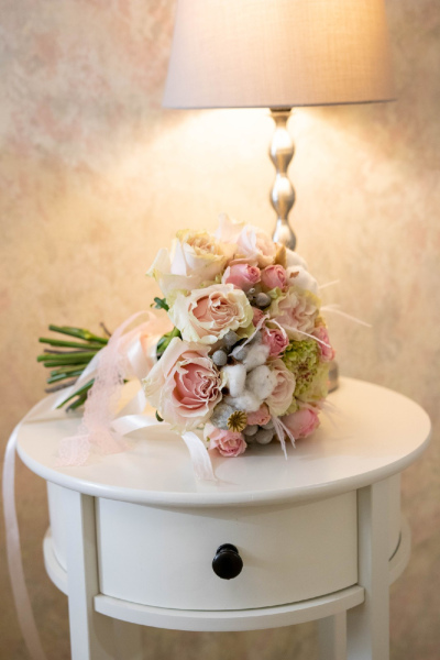 В состав входит несколько сортов роз, бруния и иные составляющие. Также букет декорирован нежными перьями, тонким капроновым кружевом и атласными лентами.