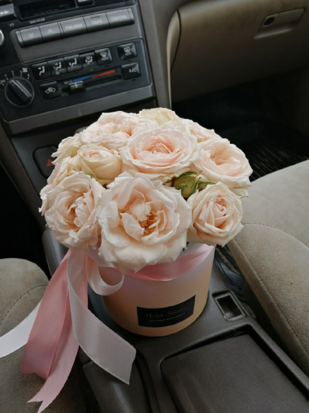 Нежная круглая коробка, наполненная кустовой розой любого оттенка, в зависимости от наличия, и хлопком (по желанию).