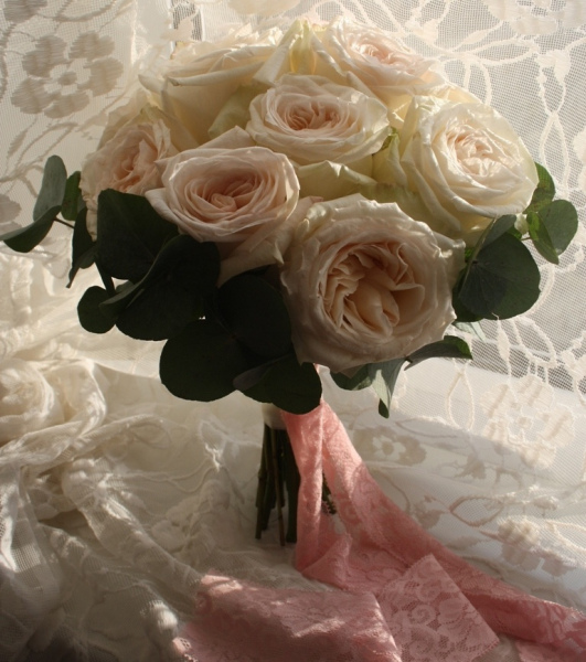 Букет невесты из ароматной, нежной пионовидной розы White o'hara и эвкалипта цинерия.