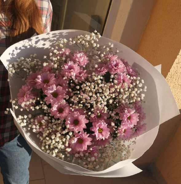 Букет из хризантем (5) и гипсофилы (4) в упаковке.