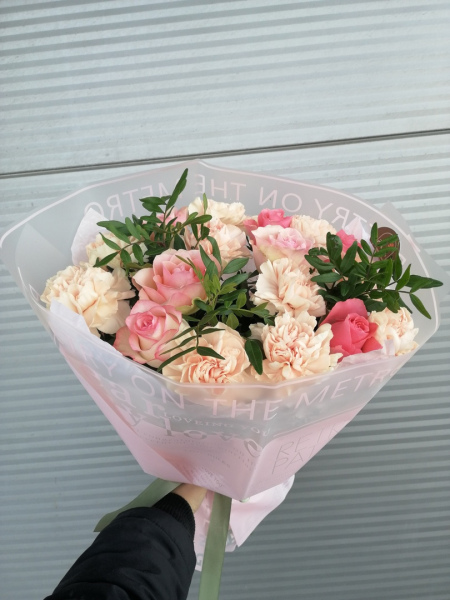 Букет из роз, зелени и диантусов любого оттенка, в зависимости от наличия.