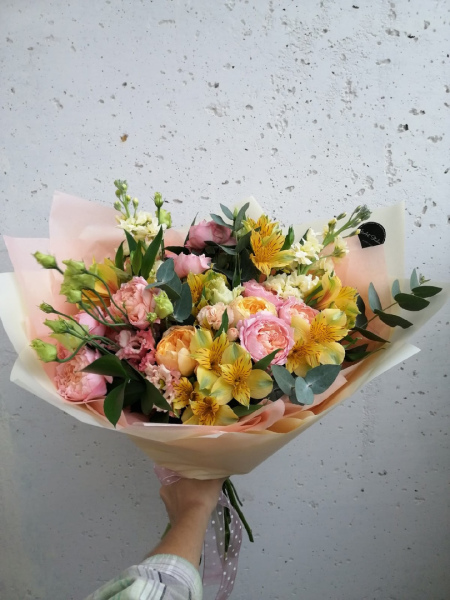 Легкий, воздушный букет из эустом, альстромерий, одноголовых роз, кустовых роз, эвкалипта, матиолы и гвоздики.