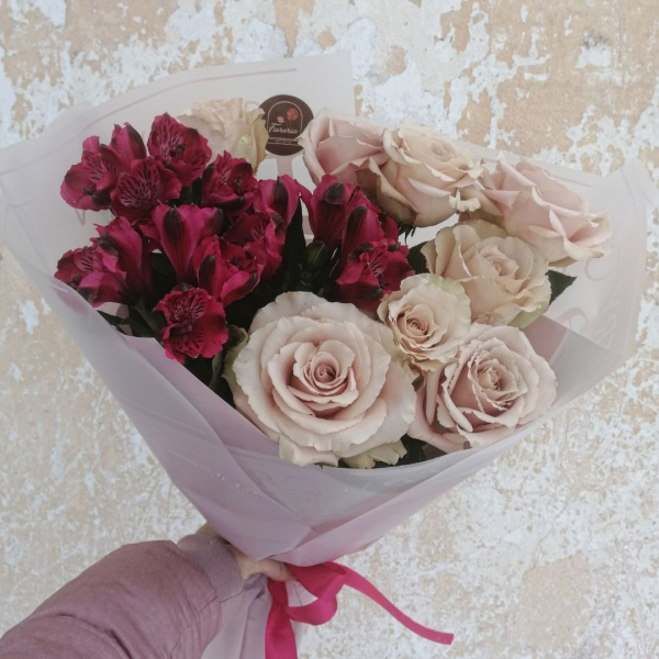 Букет с розами (9) и альстромериями (2) любого оттенка, в зависимости от наличия на складе, в корейской упаковке.