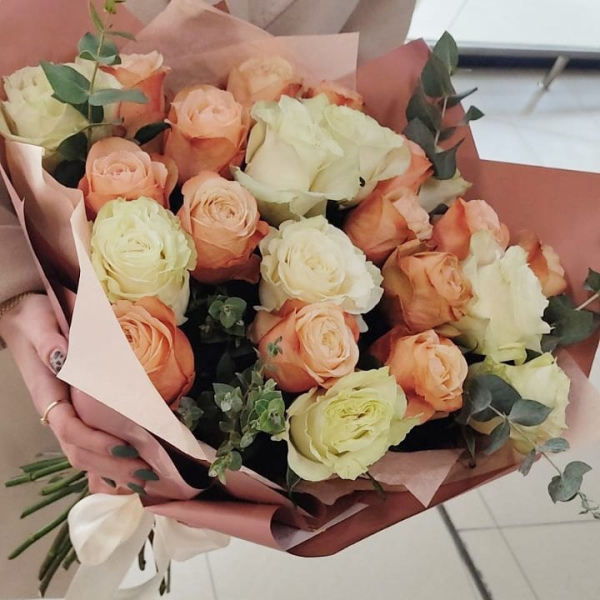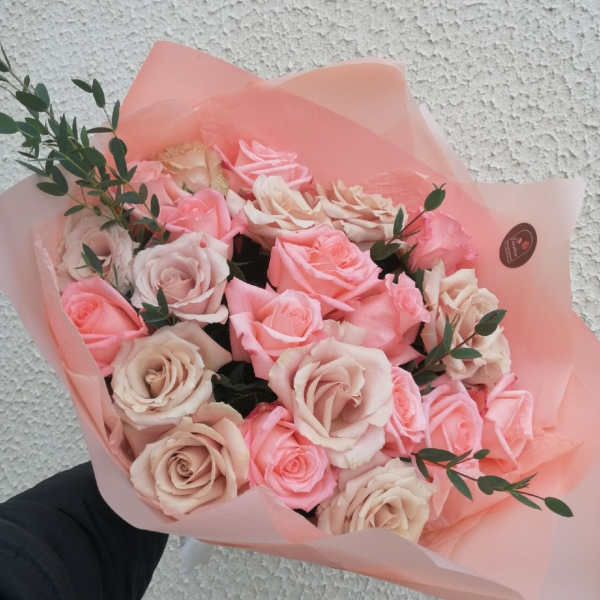 Букет из 23 роз одного или нескольких оттенков, в зависимости от наличия, с зеленью в упаковке из корейской пленки.