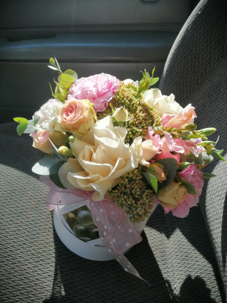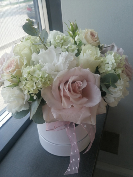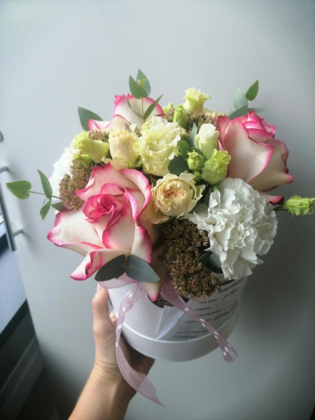 Коробка с розами кустовыми и одноголовыми, зеленью и гвоздикой