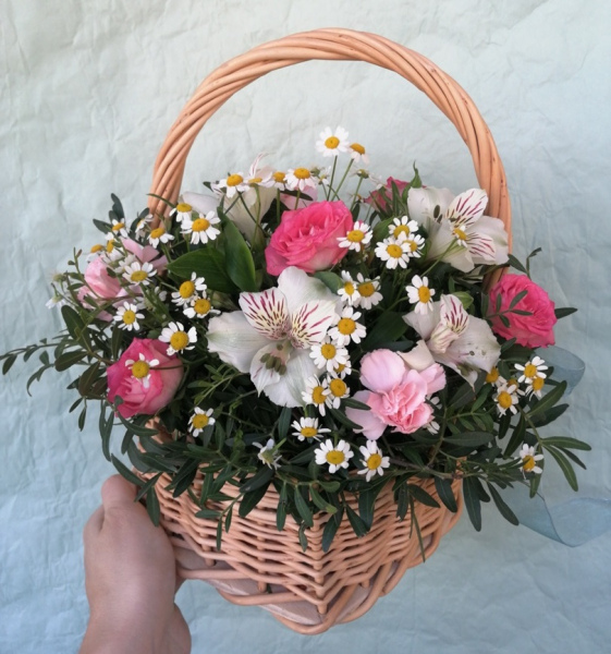 Корзина, наполненная кустовыми розами, альстромериями, гвоздиками, зеленью и танацетумом.