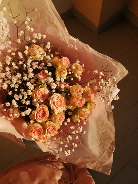 Букет из 3 веток кустовых роз и гипсофилы в двухслойной упаковке.
