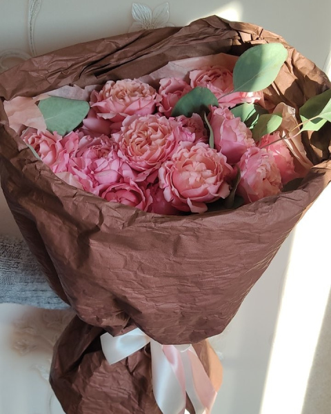 Букет из 7 веток роскошной пионовидной розы Джульетта и эвкалипта в двухслойной упаковке из жатого крафта.