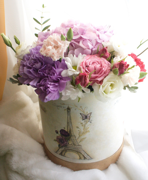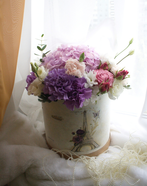Цветы в шляпной коробке. В осеннее время возможно исполнение с гортензией-сухоцветом.