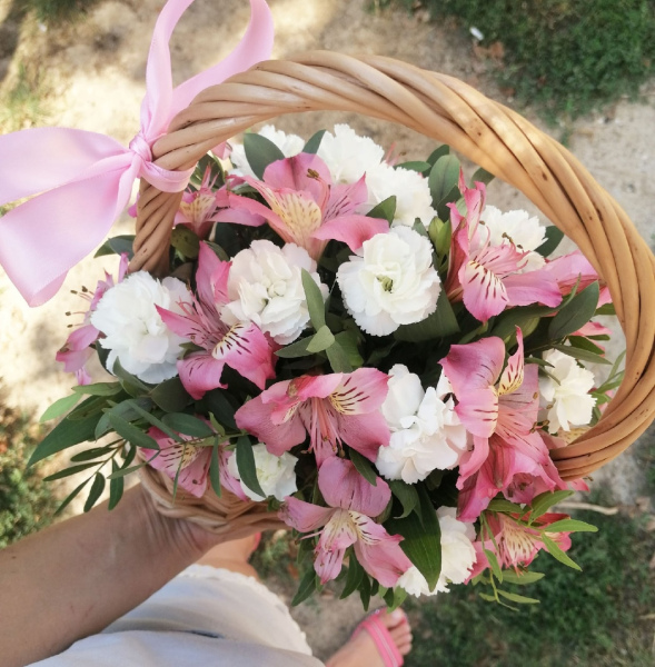 Корзина, наполненная любой зеленью, альстромериями и гвоздиками. Оттенок цветов может быть иным, в зависимости от наличия