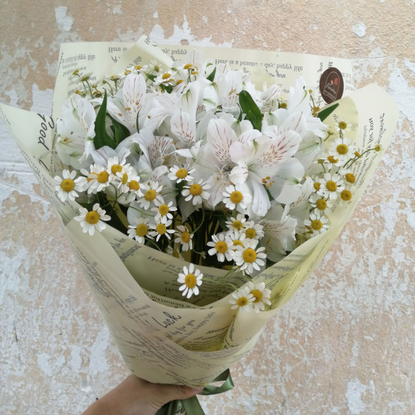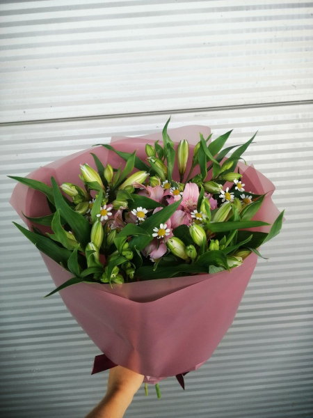 Букет из альстромерий (4) и танацетума (3) в упаковке.
