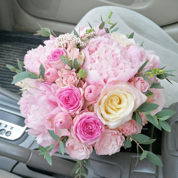 Нежный, ароматный розовый букет невесты с пионами, несколькими сортами роз, эвкалиптом, озотамнусом и др.