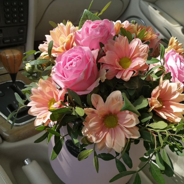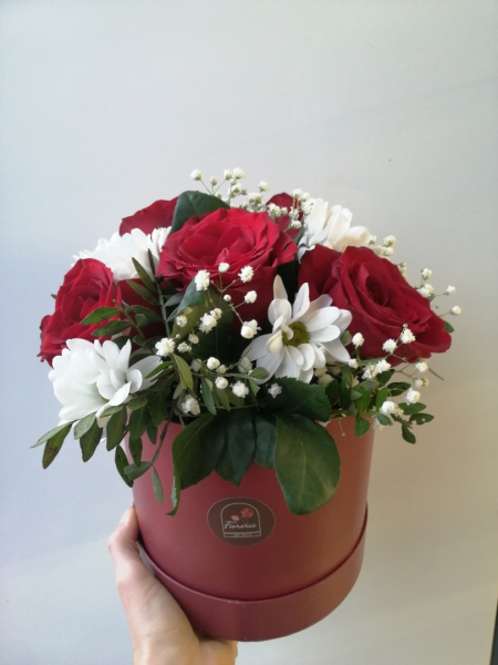 Шляпная коробка с зеленью, розами и хризантемами. Оттенок цветов и коробки может быть иным, в зависимости от наличия на складе.