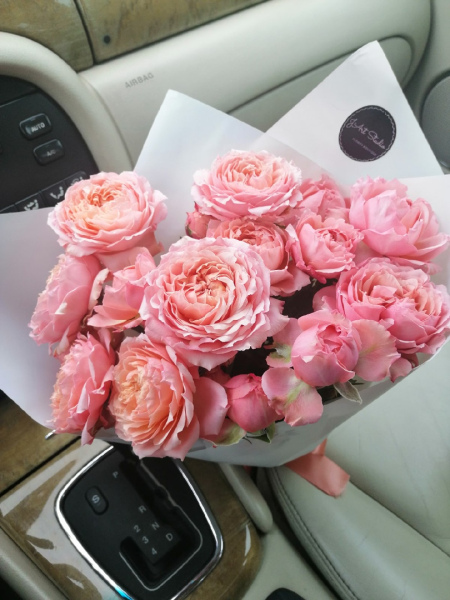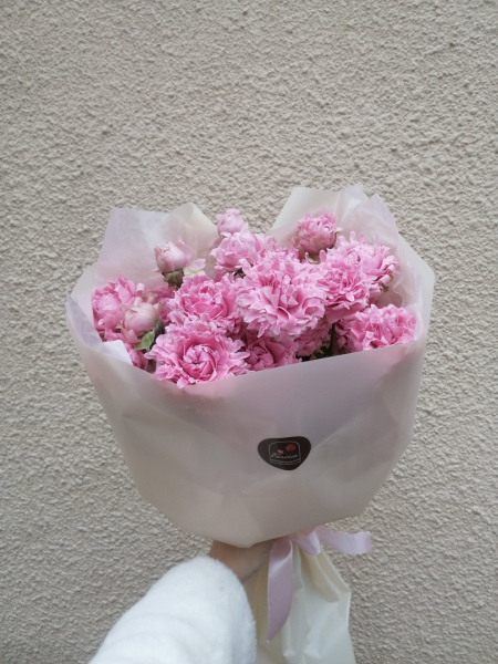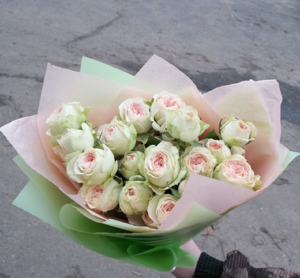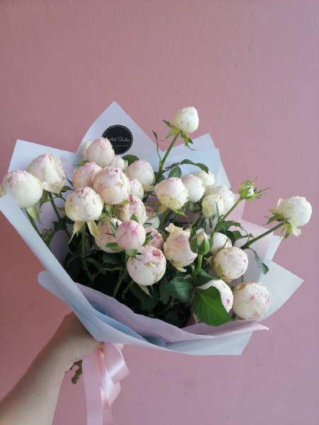 Букет из 5 веток пионовидной или ажурной кустовой розы. Оттенок и сорт могут быть иным, в зависимости от наличия.