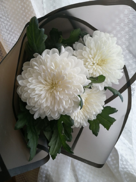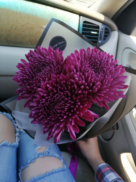 Букет из 3 одноголовых хризантем любого оттенка, в зависимости от наличия на складе и пожеланий Заказчика.