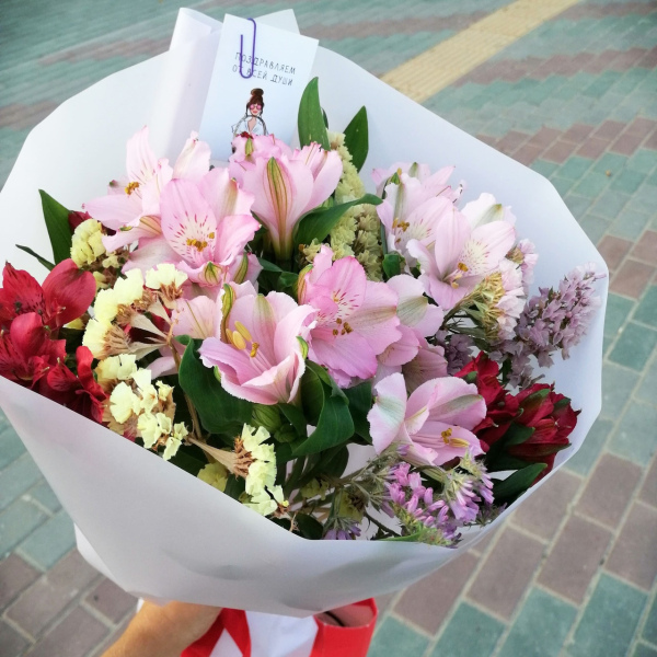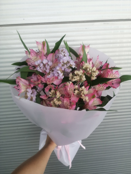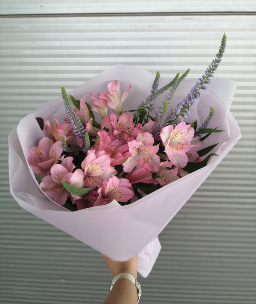 Букет из 5 веток альстромерий и 4 веток вероники/статицы или дельфиниума в упаковке.