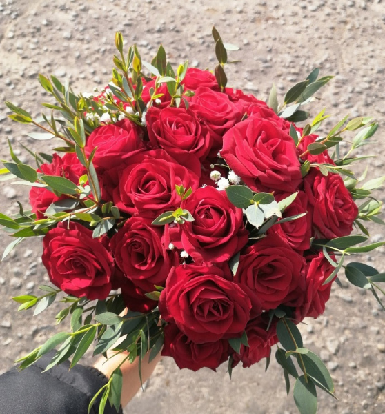 Букет невесты из красных кустовых роз, эвкалипта и гипсофилы.