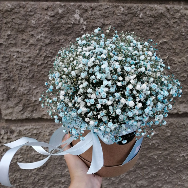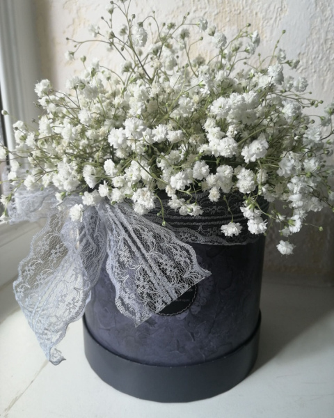 Шляпная коробка, наполненная гипсофилой. Оттенок коробки может быть иным, в зависимости от наличия на складе.