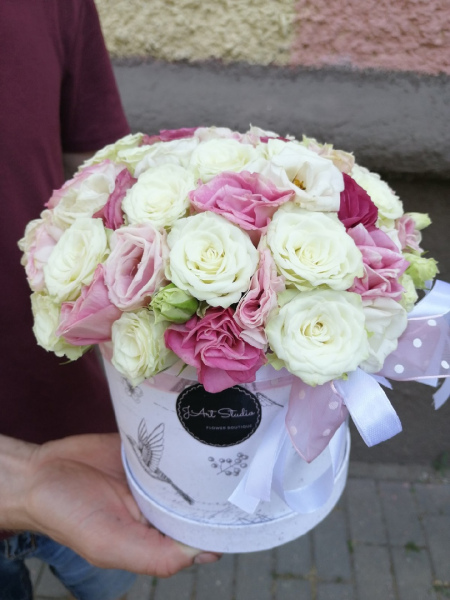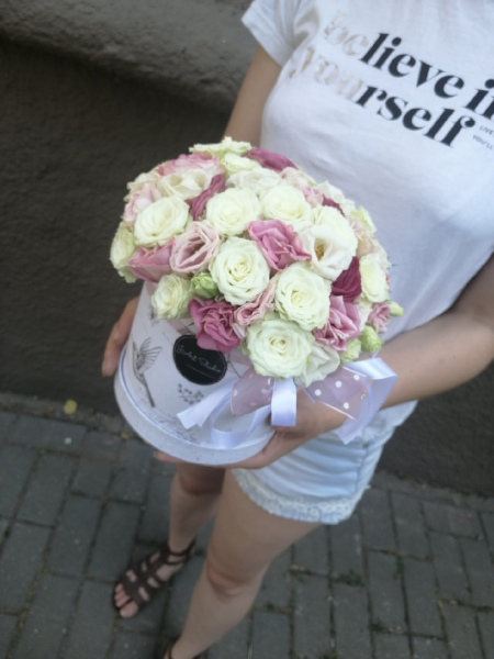 Шляпная коробка, наполненная кустовыми розами и эустомами. Оттенок цветов и коробки может быть иным, в зависимости от наличия на складе и пожеланий Заказчика.
