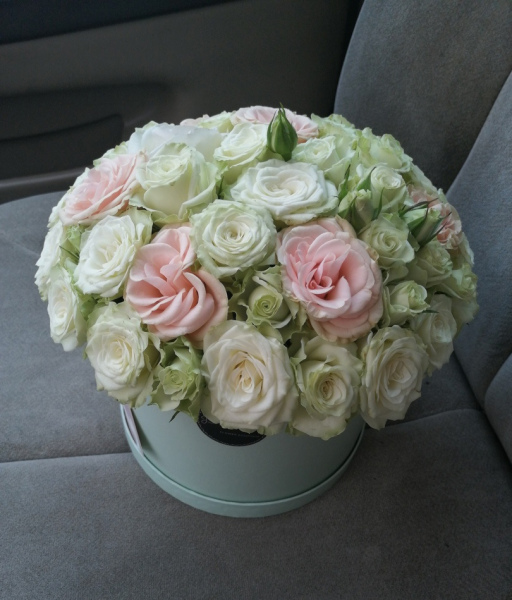 Шляпная коробка с кустовой розой одного или нескольких оттенков.