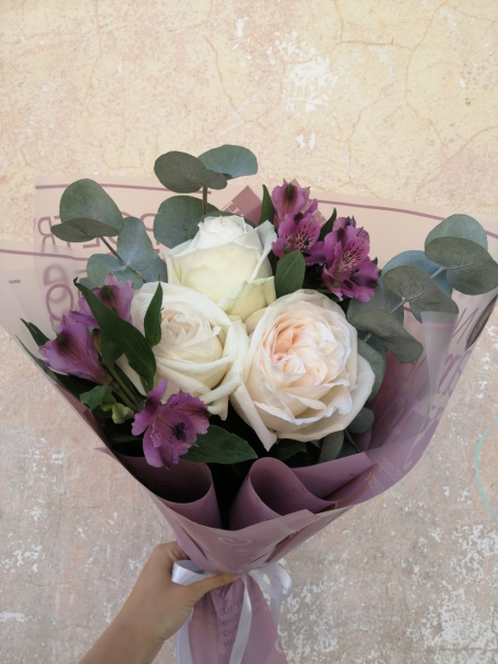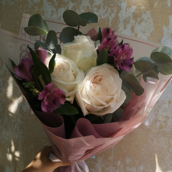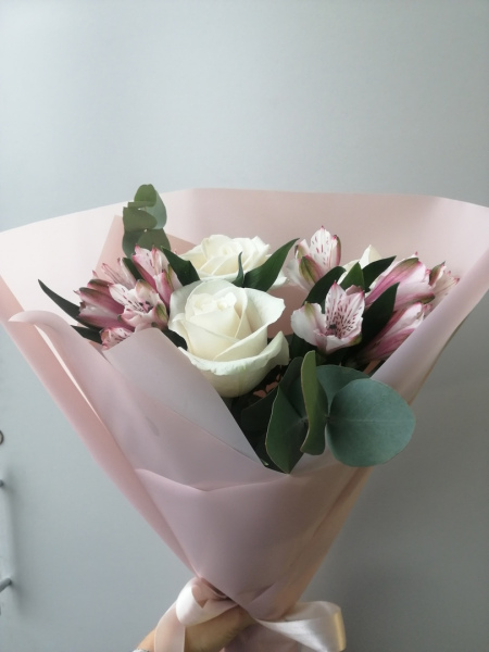Букет из 3 роз, 2 альстромерий и зелени в стильной упаковке.
