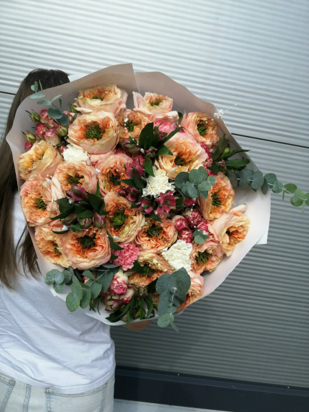 Букет из пионовидных роз, гвоздик, кустовых роз, альстромерий и зелени в двухслойной авторской упаковке.