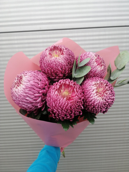 Букет из эвкалипта и 5 одноголовых хризантем любого оттенка и сорта, в зависимости от наличия.