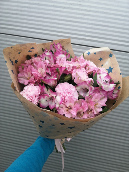 Букет из кустовых или одноголовых гвоздик (7) и альстромерий (6) в упаковке.