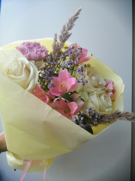 Букет из 2 альстромерий, 3 роз, 2 злаков, 1 гвоздики, 1 ветки гипсофилы в упаковке.