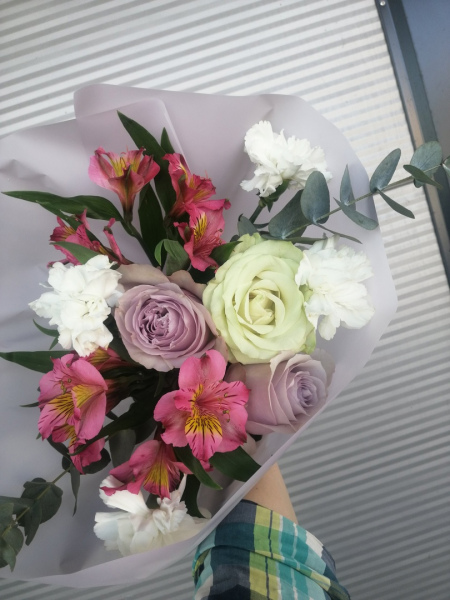 Букет из 3 роз, 2 альстромерий, 4 гвоздик, 2 веток зелени в упаковке.