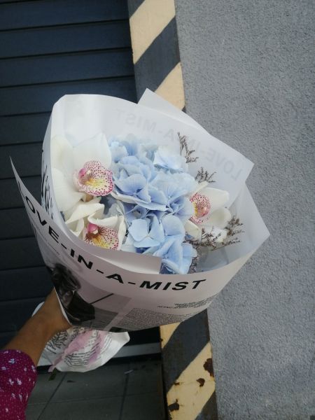 Букет из гортензии, лимониума и орхидей в стильной упаковке.
