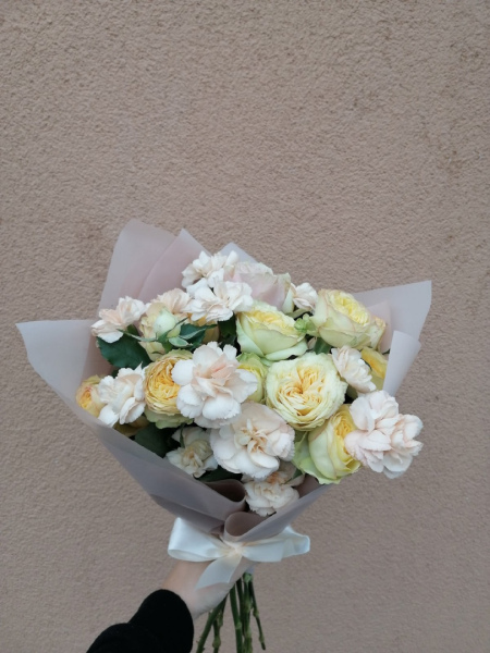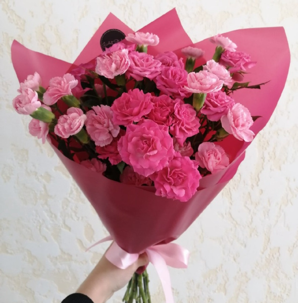 Букет из кустовой розы (4) и гвоздик шабо (3) или одноголовой, в зависимости от наличия. Оттенок может быть иным, в зависимости от наличия на складе.