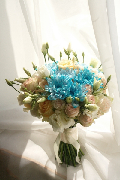 В составе кустовая роза сорта Яна, белая эустома, персиковая роза и голубые хризантемы.