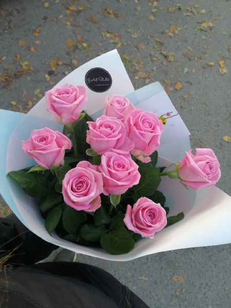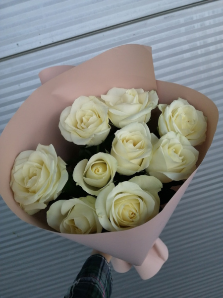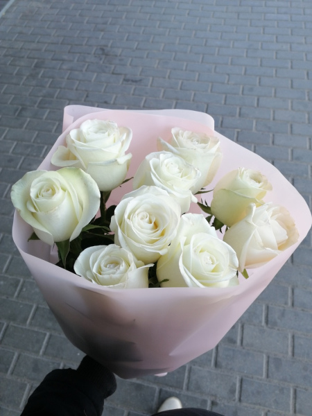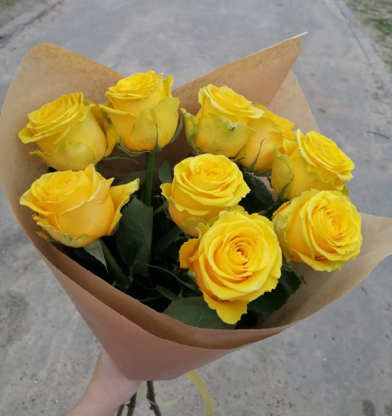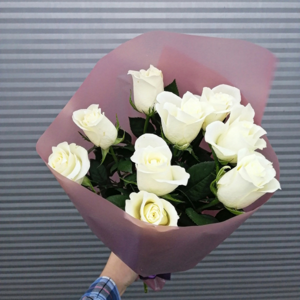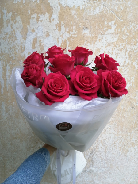 Букет из 9 роз любого цвета, в зависимости от наличия, в упаковке.