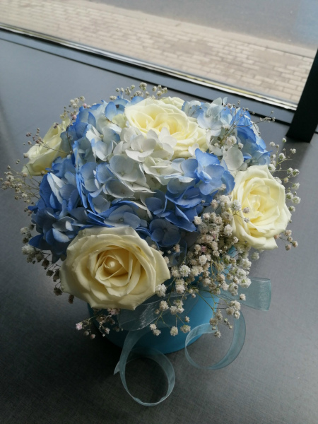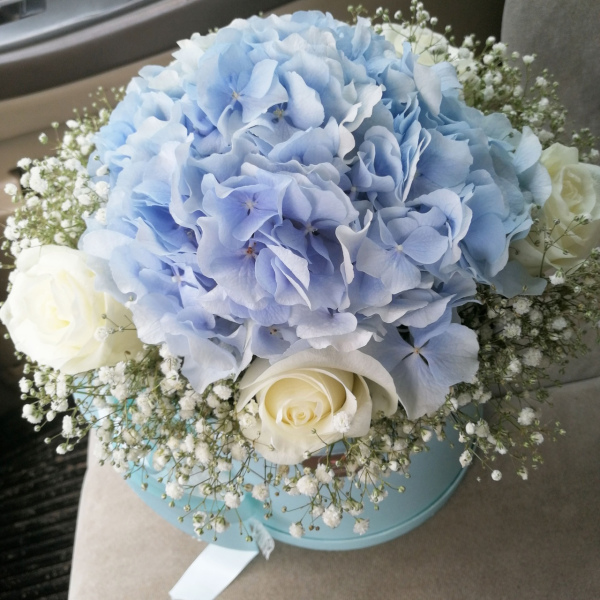 Коробка с гортензией, розами и гипсофилой. Оттенок цветов и коробки может быть иным, в зависимости от наличия.