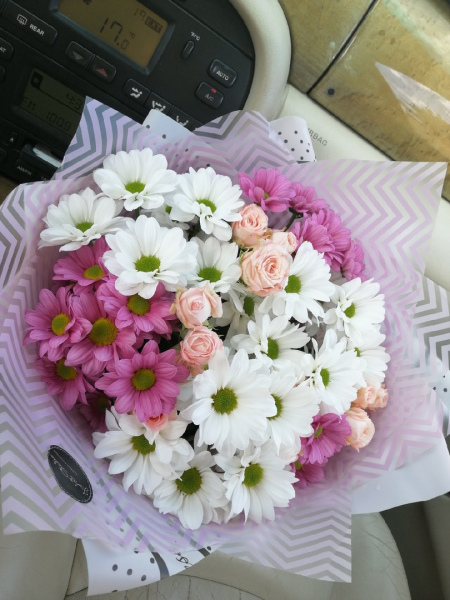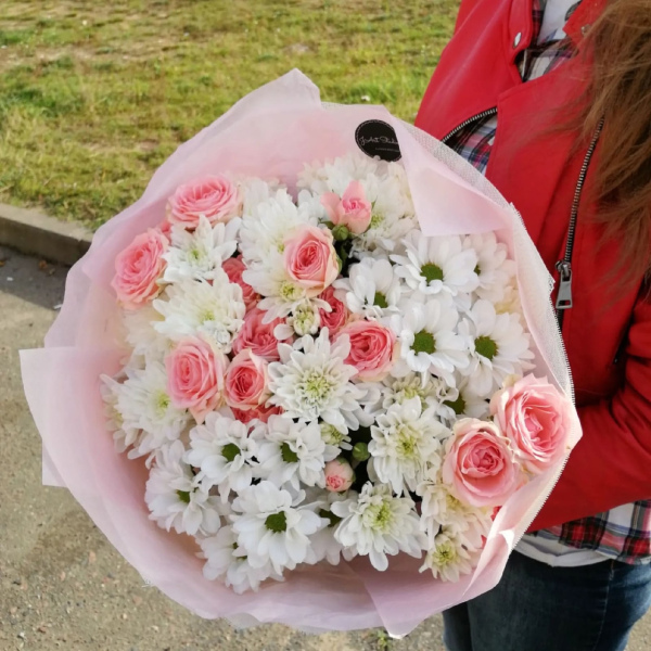 Очень нежный букет из кустовой розы (5), кустовой хризантемы (4). Соотношение может меняться, в зависимости от наличия в пределах указанной стоимости.