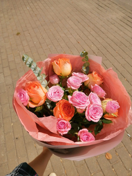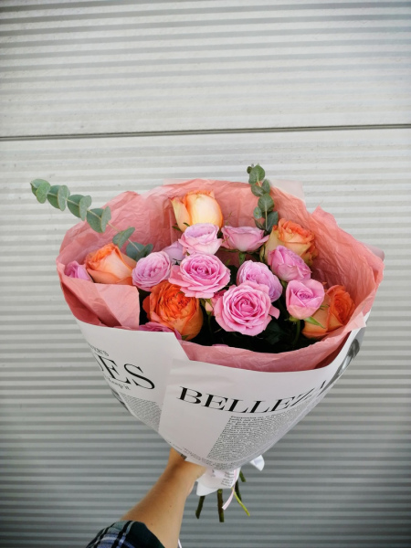 Букет из 5 роз, 2 веток кустовой розы и 2 веток зелени в двухслойной упаковке.