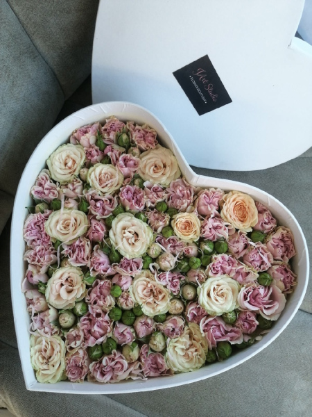 Коробка в форме сердца с кустовой розой. Оттенок и сорт роз может быть иным, в зависимости от наличия на складе и пожеланий Заказчика.