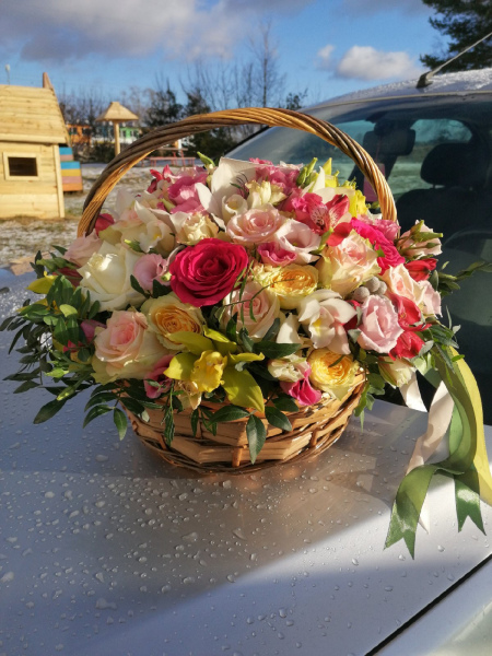 Роскошная корзина цветов: орхидеи цимбидиум, несколько сортов роз, зелень, эустома и другие цветочные ингредиенты.